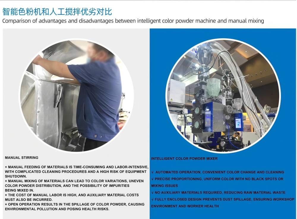 100 кг/ч«Интеллектуальное смешивание цветных порошков» можно легко интегрировать с централизованными системами подачи, центральными системами транспортировки и автоматическими системами обработки материалов. Смеситель цвета пластика оснащен высокоточными датчиками взвешивания, что обеспечивает равномерность процесса смешивания и постоянство цвета, а также поддерживает автоматическое дозирование многокомпонентных порошков и добавок.